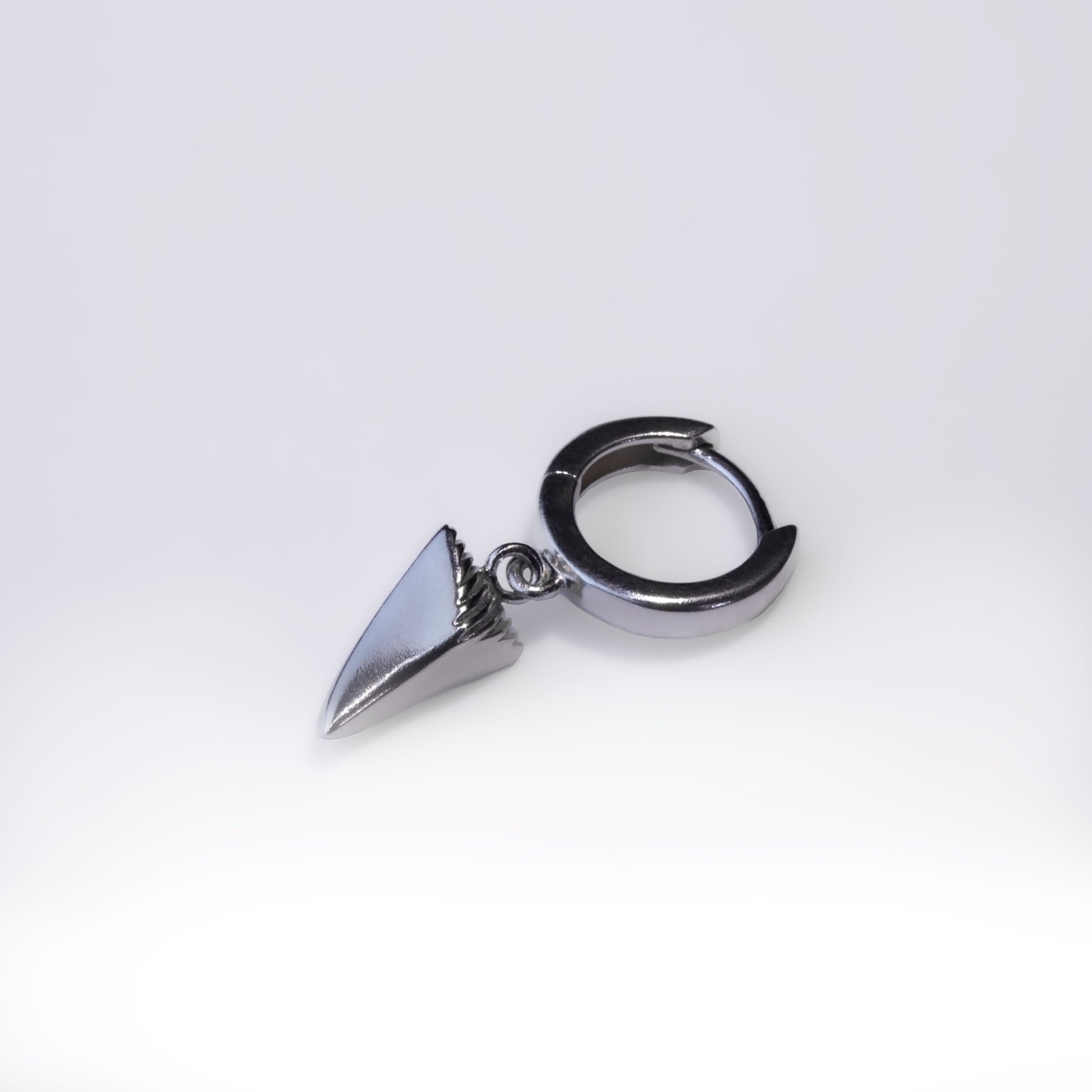 This earring features a solid metal, oxidized, carved tooth design attached to a small hoop. Available as a single earring or a pair.