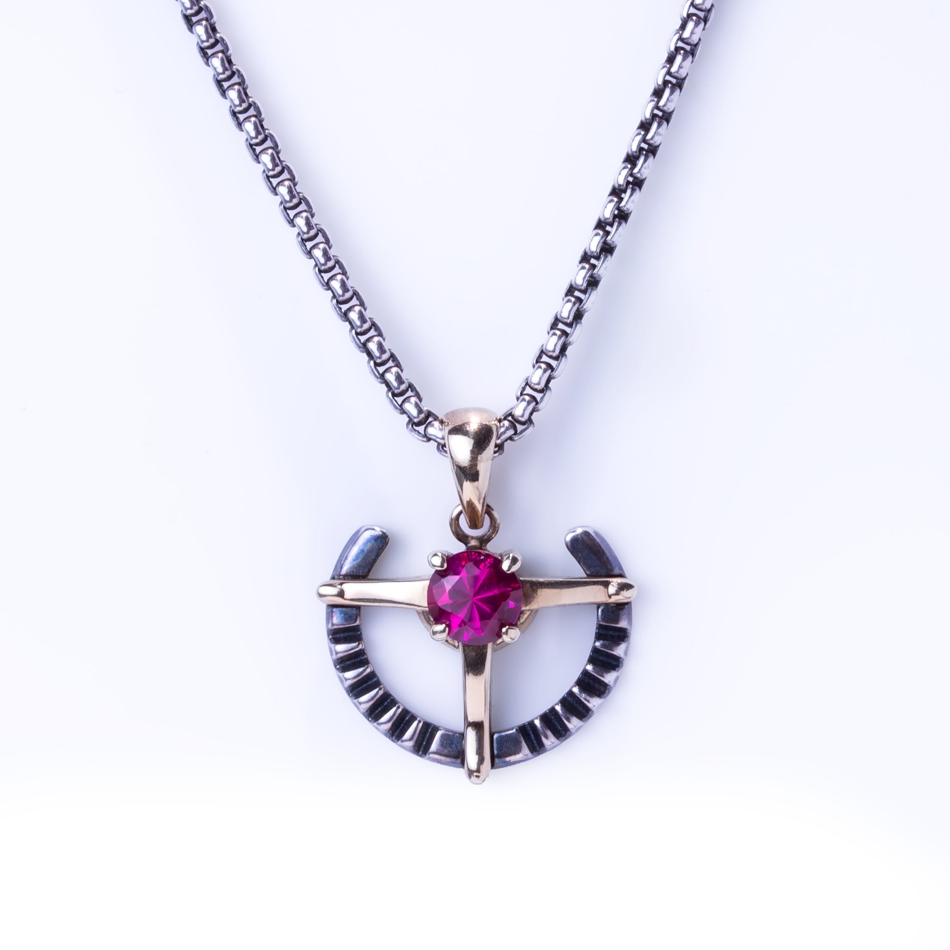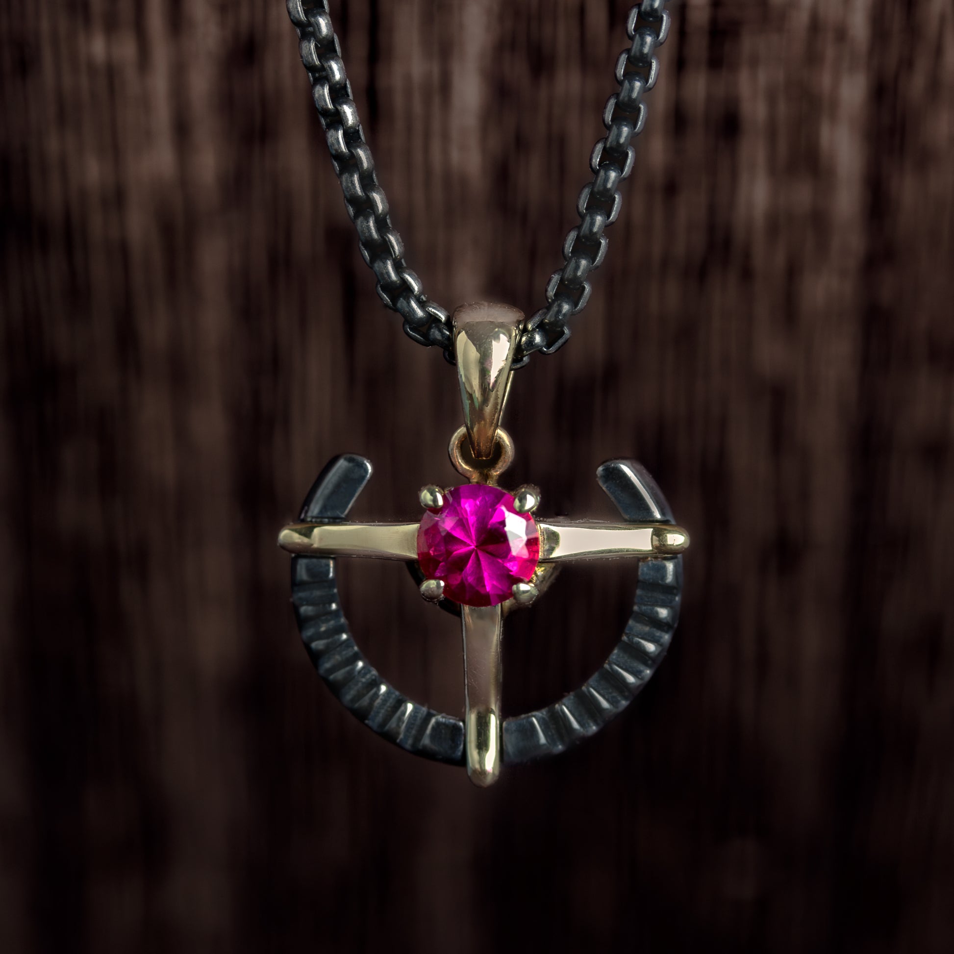 Inspired by antique navigational instruments, this bi-metal necklace features both 14k yellow gold, and oxidized silver. The faceted stone set in the middle of the design is a natural rubellite tourmaline with incredible sparkle. Due to the unique nature of this stone, this is a one of a kind piece which will not be offered again with this quality of rubellite. (Shown in these photos with a 1.8mm rounded box chain.)