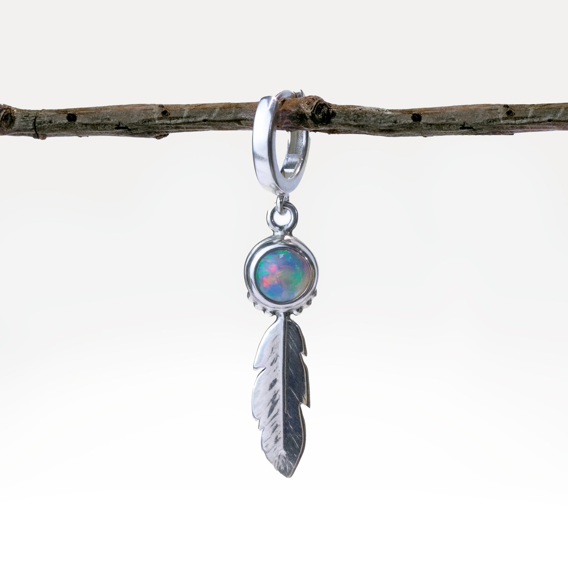 This earring features a textured feather design set with an Ethiopian opal, attached to a small hoop that moves freely with you. Available as a pair or a single earring. Available in other gemstones upon request.