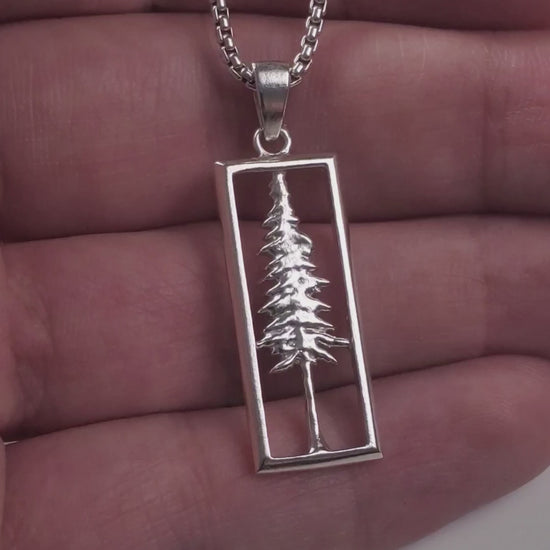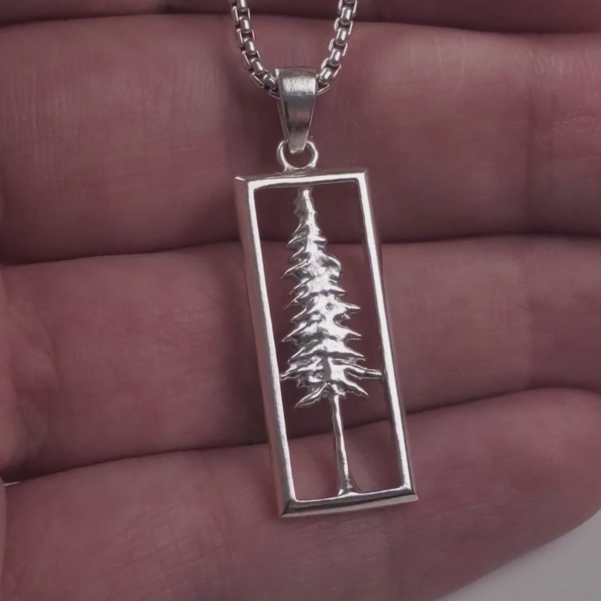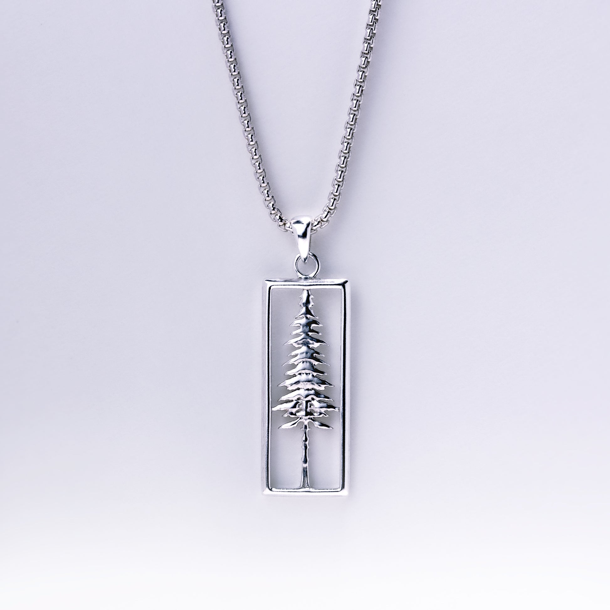 This pendant features a sculptural redwood tree placed within an open rectangular frame. The minimalist rectangular silhouette, in contrast with the organic shapes of the redwood tree, come together to form a charming and stylish necklace appropriate for any nemophilist. Available with either a 1mm or 1.8mm rounded box chain. (1.8mm chain featured in this photo)